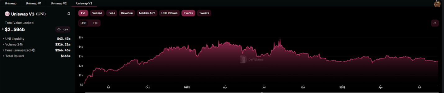 Since Panoptic’s goal is to de-fragment liquidity to create a viable market for options, it would make sense to use liquidity that’s already concentrated in a certain area. And since we’re talking about on-chain creation and exchange of options, common sense would point us in the direction of DEXs, the biggest of which is Uniswap with over $3B in TVL. More specifically, Panoptic uses UniV3 (which still has a ton of liquidity).