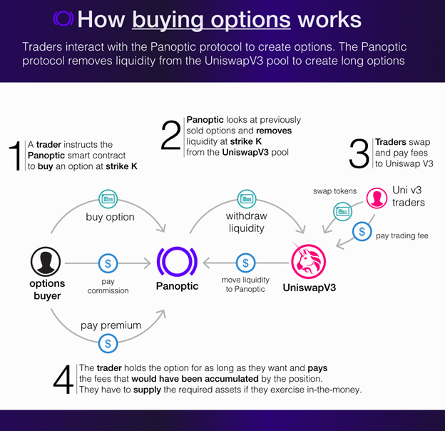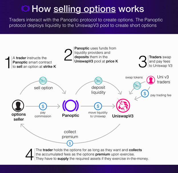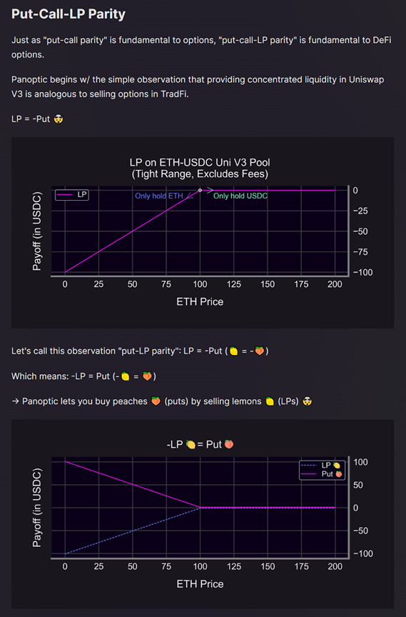 However, Panoptic isn’t using a DEX the way you’d expect. Instead of using the AMM or CLOB model or some combination of the two to support option trading, they’re going a completely different route: using Uniswap V3 LP positions to facilitate option trading.
