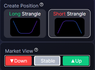 Now, what I’ve described so far represents a “neutral” strangle position, meaning that the strike price for both options is perfectly at-the-money. However, not all strangles are done this way. As such, Predy gives users the choice to adjust their positions based on their future expectations of the underlying asset’s price as well as its volatility. As you can see here, in addition to choosing a long or short strangle, you can also specify whether you want the trade to favor the asset going up or down, or remaining stable: