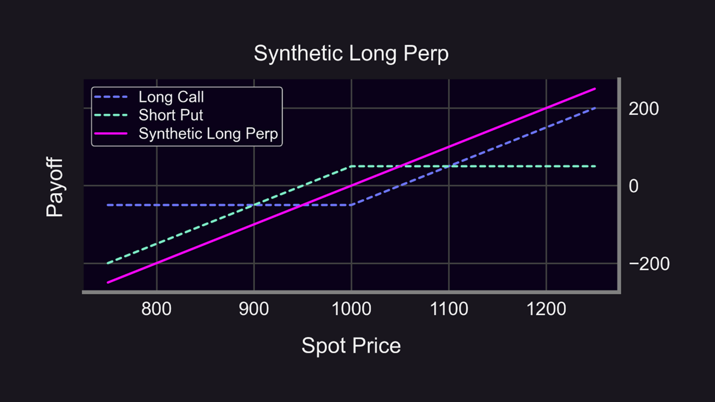 But there’s also a key difference between perpetual futures and perpetual options: perpetual futures allow traders to go long and short. But XPOs contain the same advantage that traditional options bring to TradFi: you can structure a trade to carry out a wide variety of different payout profiles. You can even create synthetic perp futures positions with options; for example, you can combine a long call and short put position to emulate a long futures position: