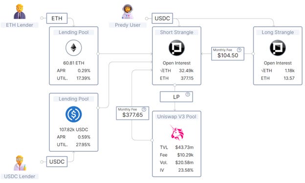 The creation of this lending market actually helps Predy to run much more efficiently and enable users to use leverage when creating their short strangle trades. As you can see below, the USDC and ETH lenders act as a source of liquidity for strangle traders: